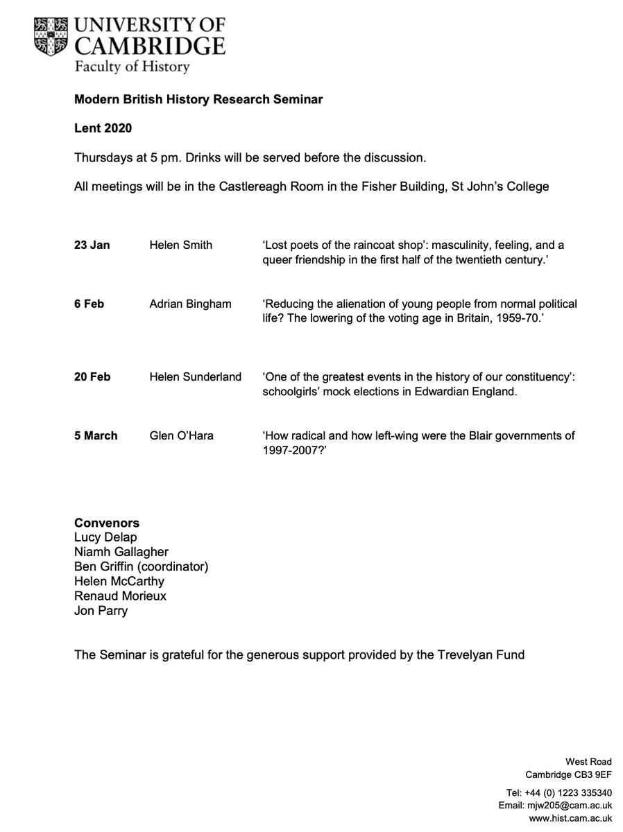 The Modern British History Research Seminar's term card for Lent is here! Alternate Thursdays at 5pm in the Castlereagh Room