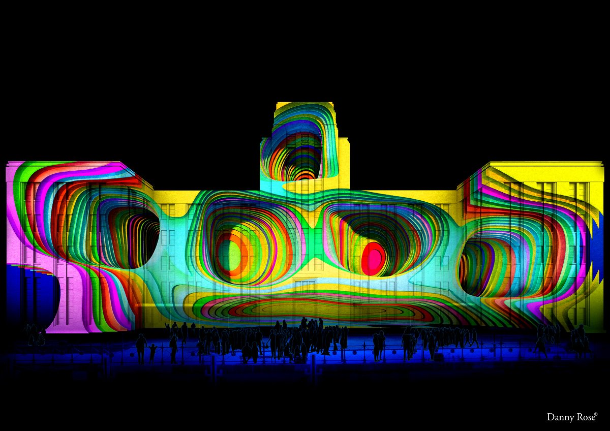 Vivid lights on! Julia Gorman and Danny Rose's creation 'Organic Vibrations' flows over the MCA façade