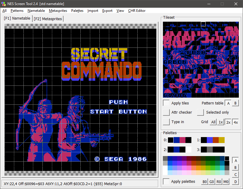 Secret Command title screen converted from Sega Master System to 8-bit NES/Famicom. 1) Final 8:7 screen 2) 4:3 NTSC simulation 3) Background tiles/nametable.pic.twitter.com/zoxTrOE9PV
