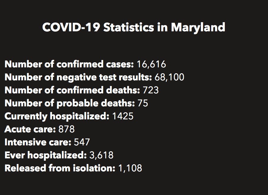 @MDHealthDept reports 16,616 confirmed cases of#COVID19 in Maryland. This marks an increase of 879 cases since yesterday. Maryland has 723 deaths, 68,100 negative tests and 1,108 patients have been released from isolation. http://coronavirus.maryland.gov pic.twitter.com/ZKtgw8ekgf