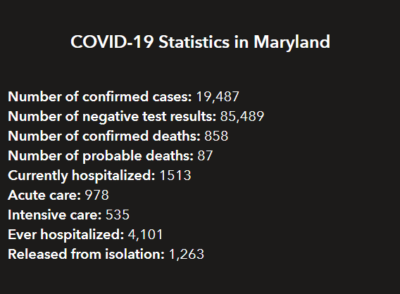 @MDHealthDept reports 19,487 confirmed cases of#COVID19 in Maryland. This marks an increase of 906 cases since yesterday. Maryland has 858 deaths, 85,489 negative tests and 1,263 patients have been released from isolation. http://coronavirus.maryland.gov pic.twitter.com/OfObH8O7Zf