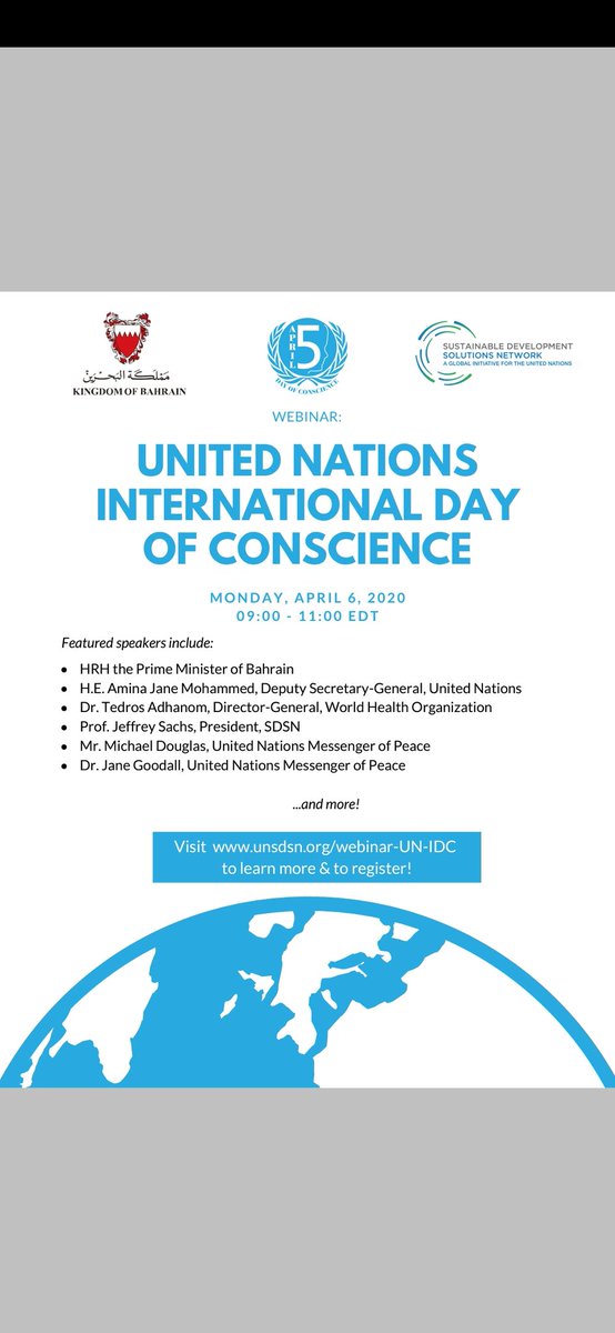 on International Day of Conscience, April 6th, 2020. Featuring @AminaJMohammed , Michael Douglas, @JaneGoodallInst, the PM of Bahrain @HRH_Khalifa, WHO DG @DrTedros, Prof @JeffDSachs