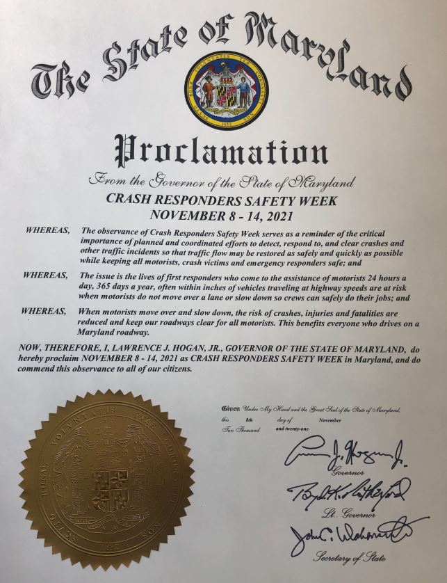 @GovLarryHogan declares Nov 8-14 Crash Responder Safety Week in MD. MDOT SHA & our partners urge motorists to Move Over when approaching traffic incidents & when they see emergency response patrol teams assisting other motorists. Learn more at https://bddy.me/3o0abFH .#mdotsafetypic.twitter.com/uBpg9vzSZo
