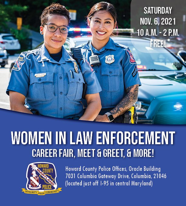 Our Women in Law Enforcement Career Fair is tomorrow! Join us at 7031 Columbia Gateway Drive in Columbia (Oracle building) from 10am-2pm to learn about HCPD and other regional agencies; to meet women leaders in the department; & more. Participating agencies in the next tweets...pic.twitter.com/lsg43TXHW9