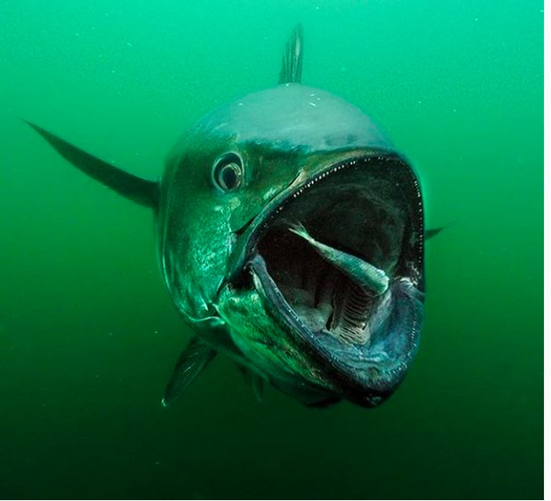 Such a cool shot!! - An Atlantic Bluefin Tuna weighing close to 1000 pounds feeding on a piece of herring in the chilly, green waters of Canada's Gulf of St. Lawrence. natgeoPhoto by