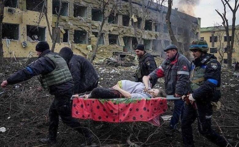 A pregnant woman pictured being evacuated from a bombed maternity hospital in