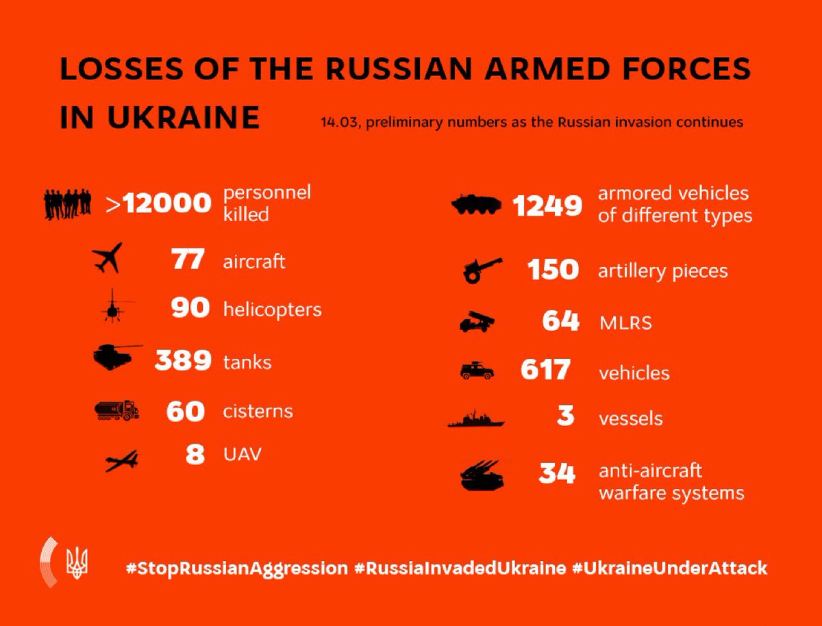 Information on Russian invasion Losses of the Russian armed forces in Ukraine, March 14pic.twitter.com/MyHzJckGxf