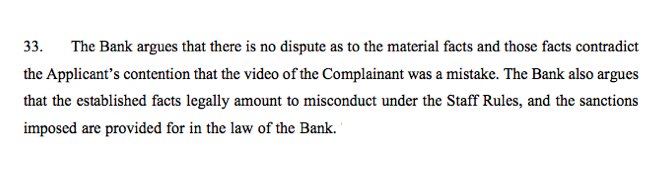 I think what people are taking away from these tweets is that the WB does not consider 'planning & filming an upskirt video' a fireable offense, where reading the Tribunal judgement it seems that they do https://webapps.worldbank.org/sites/wbat/Judgments%20and%20Orders1/DN%20v.%20IBRD%20544.pdf …pic.twitter.com/hvI1yPMn65
