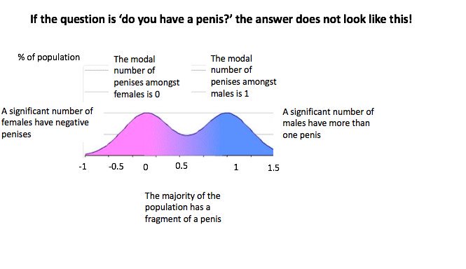 No really this is nonsense on stilts! Males and female populations overlap on lots of axes (shoe size for example). But shoe size is not how we identify the sexes.https://twitter.com/josh_t_dean/status/1045684301885575169 …