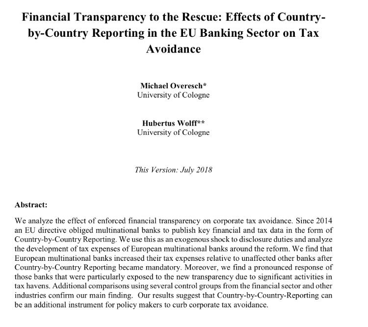 Been seeing this new-ish paper on the revenue effects of EU public #CBCR for banks making the rounds. Authors estimate 3.7%-pt rise in ETRs. Will tweet out some thoughts later, but just now I’m intrigued what #TaxTwitter thinks? https://papers.ssrn.com/sol3/papers.cfm?abstract_id=3075784 …pic.twitter.com/kZW9MOXFWD