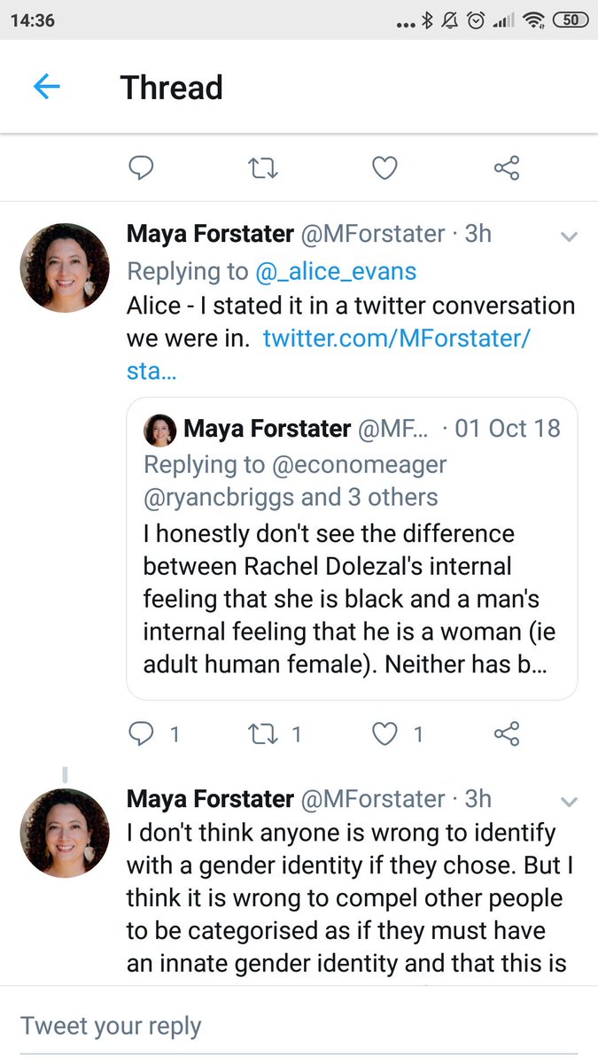 Alice, as I have already told you, this was a tweet on my personal Twitter account, not something I said to an individual colleague at work.https://twitter.com/MForstater/status/1046879928162181120 …