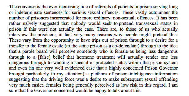 Separately yes people are *also* concerned that policies that allow males to have access to vulnerable women based on 'self identification' will be abused. For example this is evidence given to parliament by the President of the British Assoc of Gender Identity Specialistspic.twitter.com/rVGslrIOn1