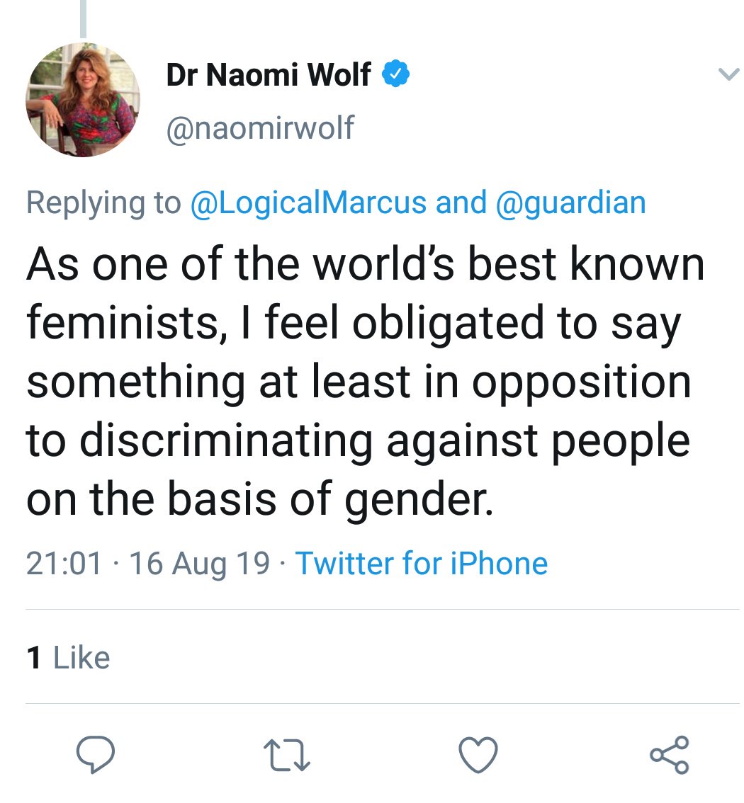 Hey Dr @naomirwolf, for one of 'best known feminists', w 64k followers, yr tweets got few ♥️s, but lots of articulate responses from much less well known feminists (aka: ordinary women). Why not try to understand what these 👭 are saying instead of dismissing as unfathomable?pic.twitter.com/ZpyS6u6y0y
