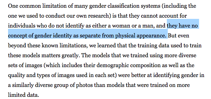 But it begs the question - why seek to train the machines to identify gender in the first place. Why not just identify sex? I mean given that we know that gender identity is internal, subjective & invisible, why would they even start there? Its not like sex is wholly unimportant!pic.twitter.com/feXgCgsnTM