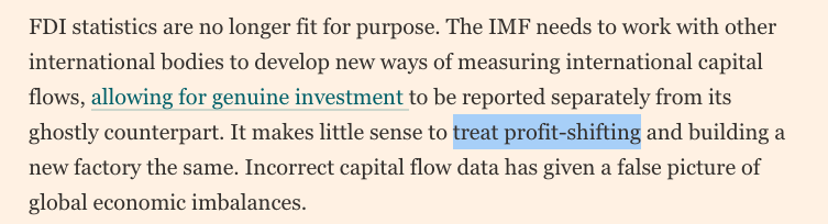 [Tax] Sloppy reporting by @FT. This is a about how international statistics measure cross-border investment. Yes it makes no sense to treat building a factory same as registering a holding company. But calling the second "profit shifting" is silly https://www.ft.com/content/44de0898-d2fb-11e9-a0bd-ab8ec6435630?desktop=true&segmentId=d8d3e364-5197-20eb-17cf-2437841d178a#myft:notification:instant-email:content …pic.twitter.com/dsTL9ueLaj