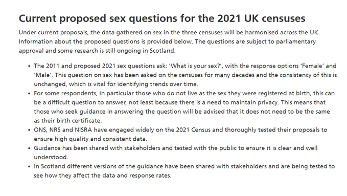 That there is a separate gender id q (E&W, Scot) means this is now a debate about whether authorities *can* also ask about sex as recorded on a birth certificate. If that ability is lost in the high-profile context of the census, it will lead to a loss of data on sex more widely.