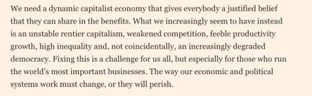 He points to the problem; rentier capitalism, weakened competition, feeble productivity growth, high inequality & degraded democracy ....pic.twitter.com/IjfDTpl53B