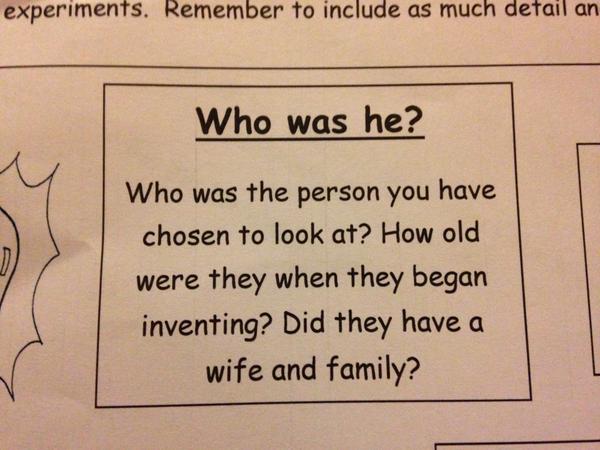 Primary school homework: write about a scientist 'Who Was He? Did he have a wife and family?" WTF? from @megperrymanpic.twitter.com/tZ692YRpcC