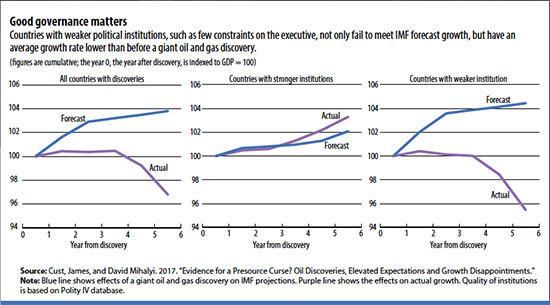 Overoptimism on resource wealth + weak institutions --> The Presource Curse say @davidmihalyi @jimcust . A 500-million-barrel oil discovery seen as vast wealth for all. But over 20-year production might be only $30 revenue/ capita http://www.imf.org/external/pubs/ft/fandd/2017/12/cust.htm …pic.twitter.com/Yrk0C487ti