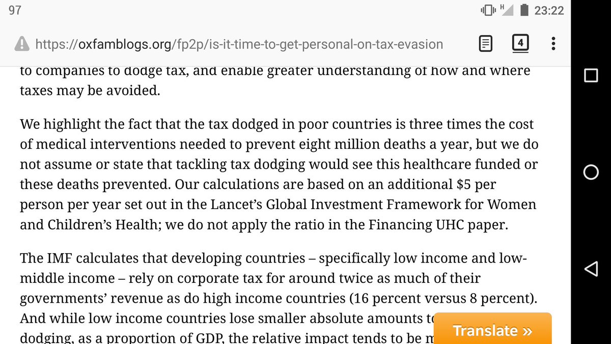 The statitics are in the accompanying press release https://www.oxfam.org.uk/media-centre/press-releases/2017/10/a-third-of-tax-dodged-in-poor-countries-enough-to-prevent-8m-deaths-a-year … - Linking the $100 bn estimate to 'poorest countries' is misleading https://www.oxfam.org/en/multimedia/video/2017-tax-dodging-heist-no-one-talking-about …