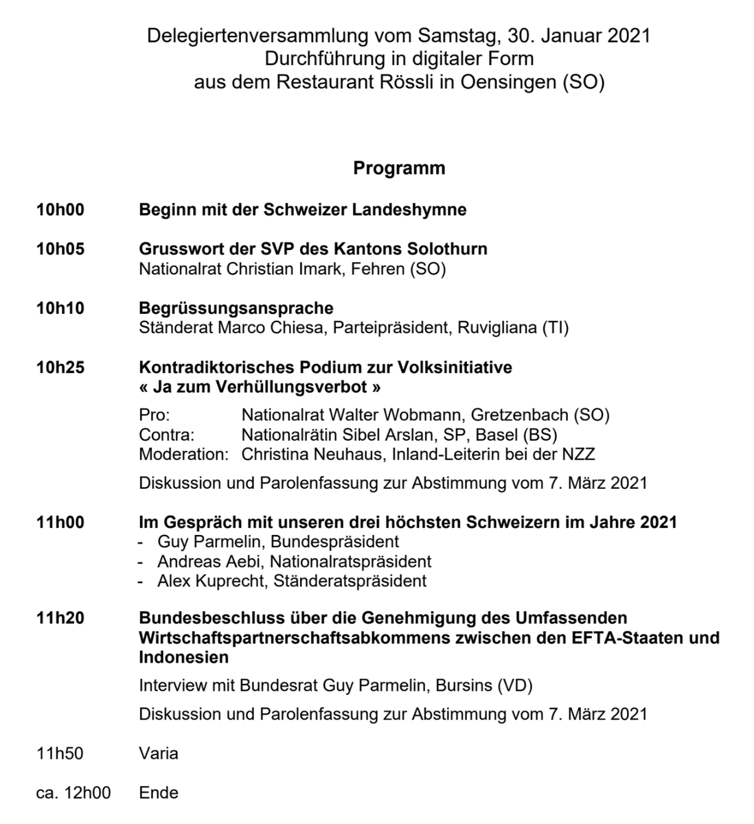 Es irritiert, dass ausgerechnet die grösste demokratische Partei, die @SVPch, keine Parolenfassung an der Delegiertenversammlung will. Gemäss Einladung werden die Geschäfte «Ja zum Verhüllungsverbot»,