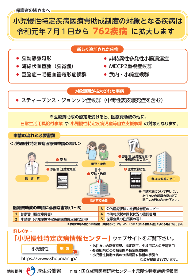 【難病のお子さまに対する医療費助成の対象を拡大しました】 この制度では、慢性疾患を持つ児童などの医療費を助成しています。医療費助成に関する相談や申請は、お住まいの都道府県、指定都市または中核市の担当窓口まで。 詳しくは→https://www.shouman.jp/support/