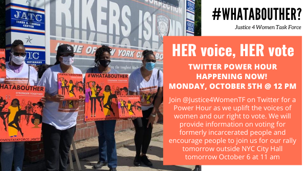 #WhatAboutHer#HerVoiceHerVote Twitter Power Hour! Today we will be discussing the importance of voting for justice-impacted people. Make sure to join us TOMORROW at 11AM on ZOOM or in front of NYC City Hall for our rally!pic.twitter.com/g49n0eMQOK