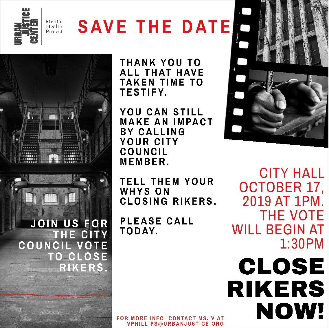 Call your council member's on why #closingrikers is important to you. Save the date for the City Council Vote! Contact V for more questions vphillips@urbanjustice.orgpic.twitter.com/Gp6MTEwjaL