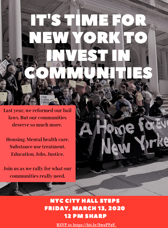 Join the rally on March 13th at NYC City Hall to demand investment in our communities! RSVP here: https://bit.ly/2wuPPgE pic.twitter.com/NdbphIP48S