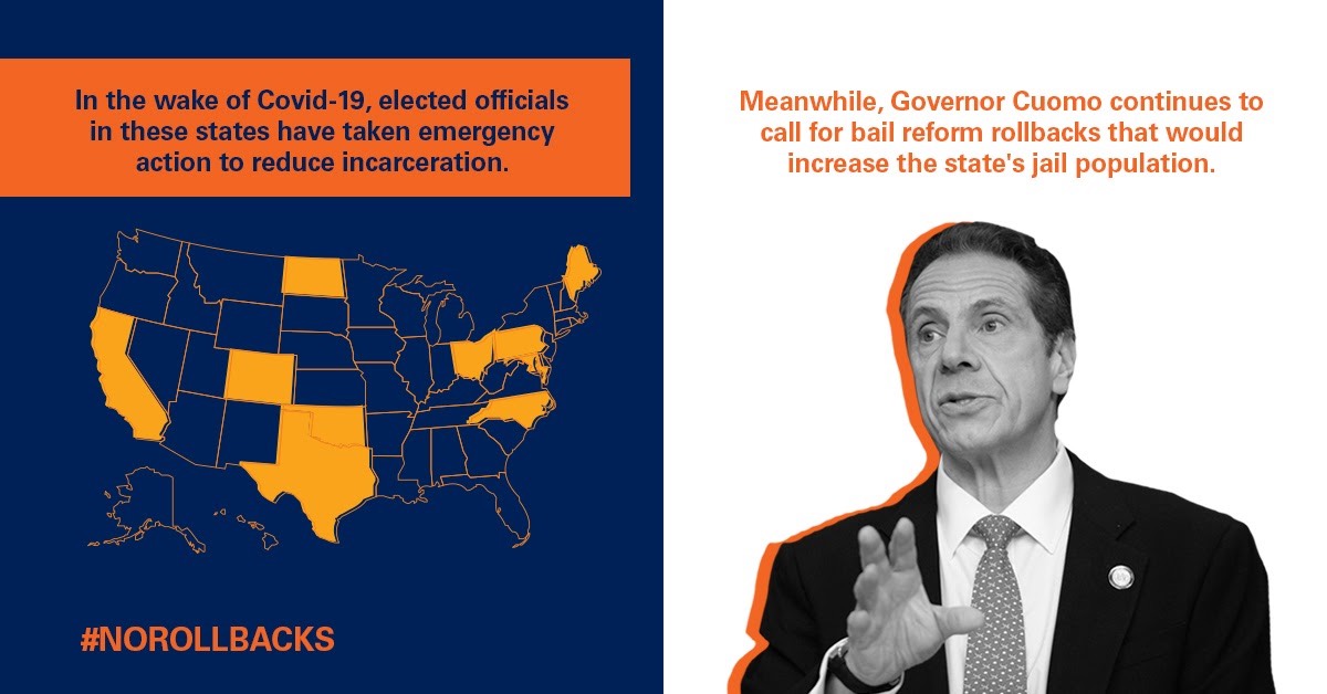 Elected officials across the country are taking steps to get people out of prisons and jails, COVID-19. Meanwhile, @NYGovCuomo is calling for bail reform rollbacks that would put thousands MORE NYers in jail. This is shameful. #NoRollbackspic.twitter.com/cbFD3vKgQX