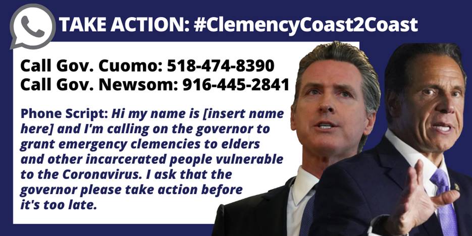 URGENT: Call @NYGovCuomo & @GavinNewsom on behalf of thousands of incarcerated NYers and Californians who are vulnerable to #COVID19. Prisons, jails & detention centers are no place to quarantine or protect people from this pandemic. Tell them to #LetThemGo! #ClemencyCoast2Coastpic.twitter.com/CPWefmo12p