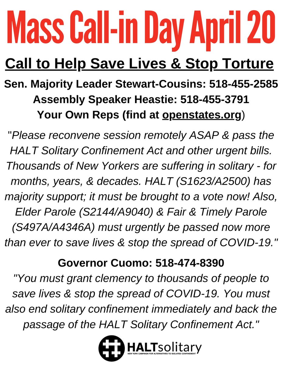 Please join a Mass Call-in Day TODAY by making calls to demand that the New York Senate and Assembly immediately reconvene remotely and pass the HALT Solitary Confinement Act, Elder Parole, Fair & Timely Parole and other urgently needed bills #HALTsolitary #FreeOurElderspic.twitter.com/dCv93w4t8W