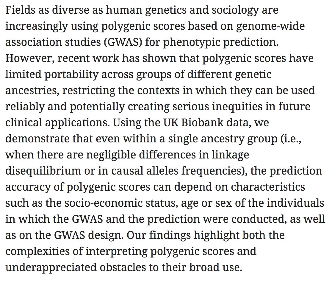 Variable prediction accuracy of polygenic scores within an ancestry group https://doi.org/10.7554/eLife.48376 … - a reminder that polygenic scores can be confounded by all kinds of things... from @molly_przew + colleaguespic.twitter.com/fHIX7JWFiW
