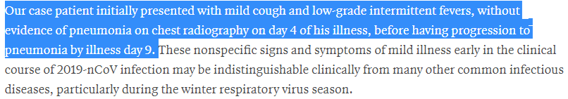 https://www.nejm.org/doi/full/10.1056/NEJMoa2001191 … 2019nCOV Symptoms: days in hospital: 1-2: nausea / vomiting 2-5: fever / tachycardia 6: severe pneumonia developed 7: treatment with intravenous remdesivir 8: improvements of symptoms, no fevers, only cough remains
