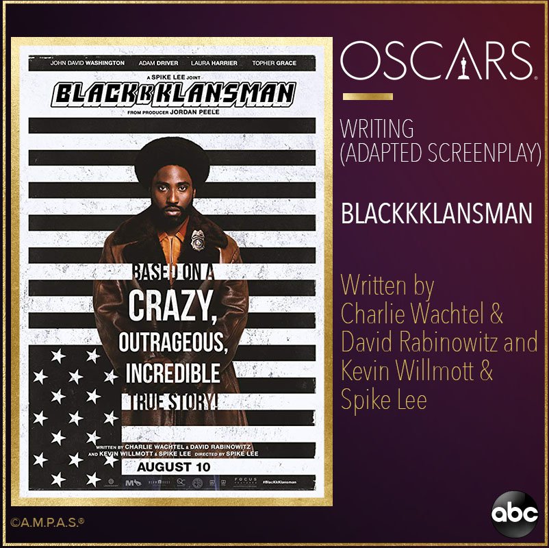 NEW: Charlie Wachtel, David Rabinowitz, Kevin Willmott and Spike Lee win the #Oscar for Best Adapted Screenplay for @blacKkKlansman #Oscars #BlacKkKlansman https://abcn.ws/2ThoDvN pic.twitter.com/D7pGXddicI