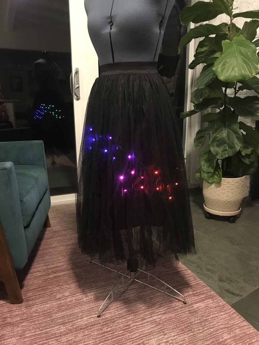 Finished the skirt for my dear friend. Attached a pocket for the battery & Gemma and updated the code. I spent more time planning than actually executing. Would love to others make similar skirts (& share where you hide the battery!)pic.twitter.com/5rT7JNMvDE