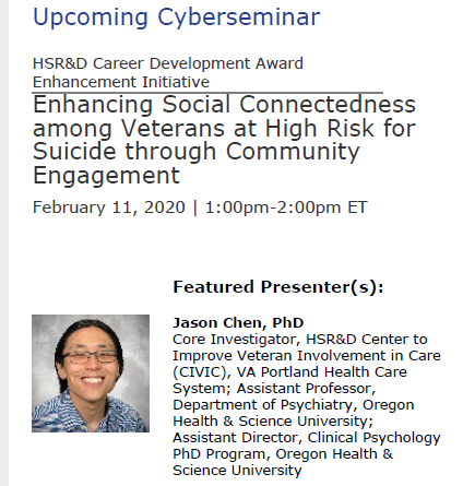 Webinar Feb 11: Enhancing Social Connectedness among Veterans at High Risk for Suicide through Community Engagement via