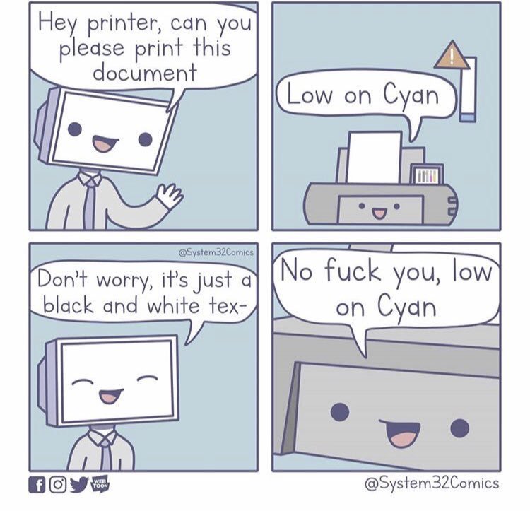 Me this morning trying to print a single black and white calendar page...pic.twitter.com/G5R0nG6Zq7