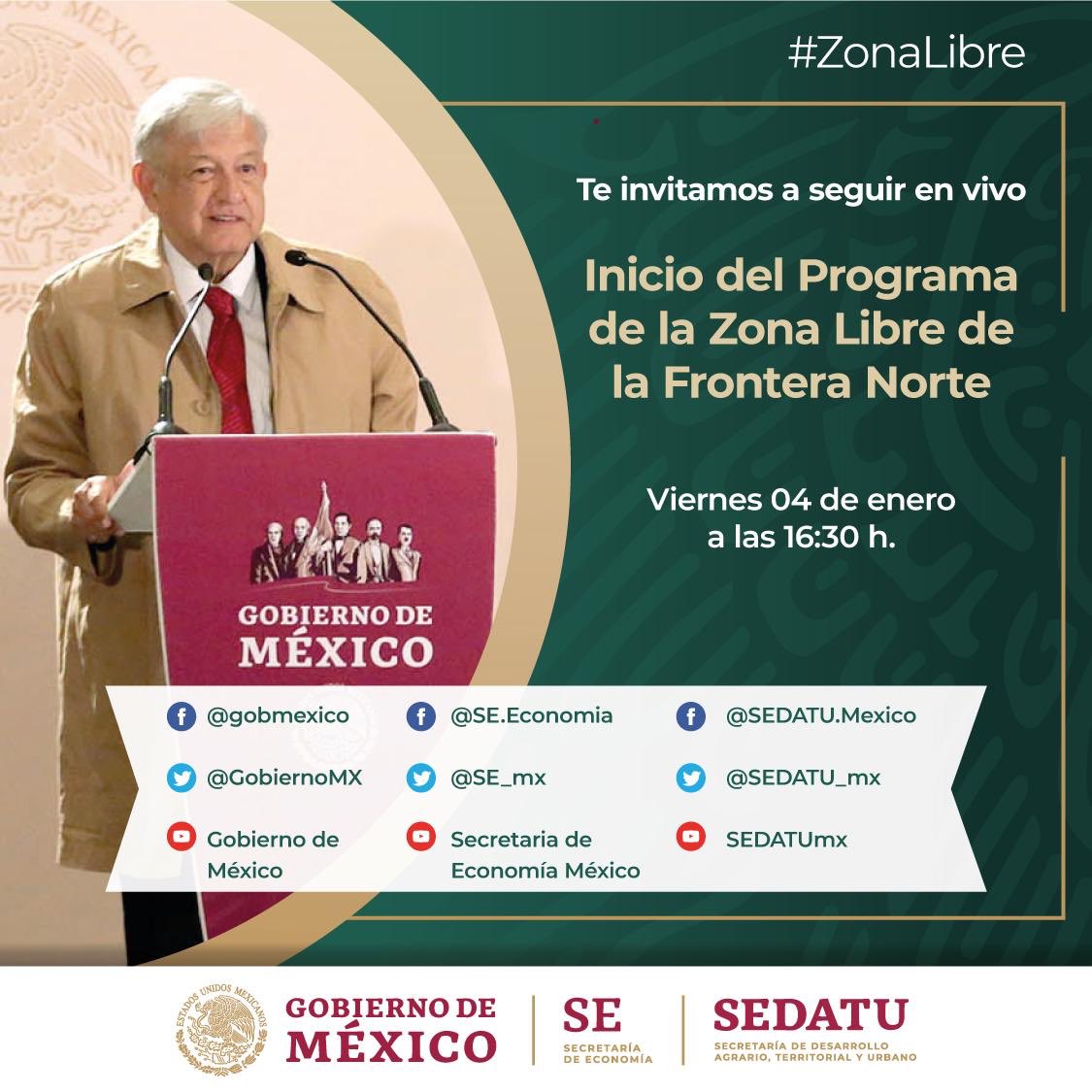 #EnVivo | 16:30 Hrs. Sigue el inicio del Programa de la#ZonaLibre de la Frontera Norte que encabezará el Presidente@lopezobrador_ desde Reynosa, Tamaulipas.#HagámosloJuntos@GobiernoMXpic.twitter.com/LL09x67gl6