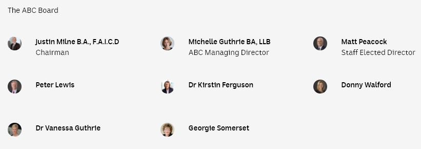 @ABCaustralia & this list of current Board members. Now, it is stacked with@TurnbullMalcolm's cronies apart from staff elected Matt Peacock. Mr Peacock is outnumbered 7-1. http://about.abc.net.au/who-we-are/the-abc-board/ …pic.twitter.com/aTe6F3BiAX