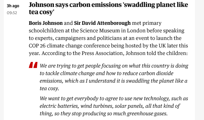 @BorisJohnson doesn’t *get* climate change Carbon emissions are not *swaddling the planet like a tea cosy*. They are behind wildfires in Australia, soaring temperature records & the broken lives of those least responsible The PM needs to understand that – and actpic.twitter.com/N1DJiaXvBx