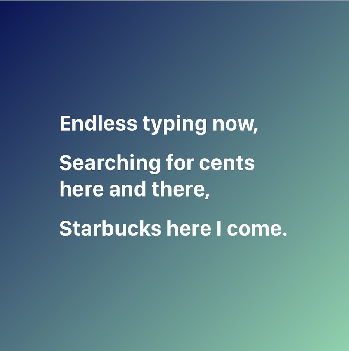 Endless typing now, Searching for cents here and there, Starbucks here I come.pic.twitter.com/5Tw3kIXbgf