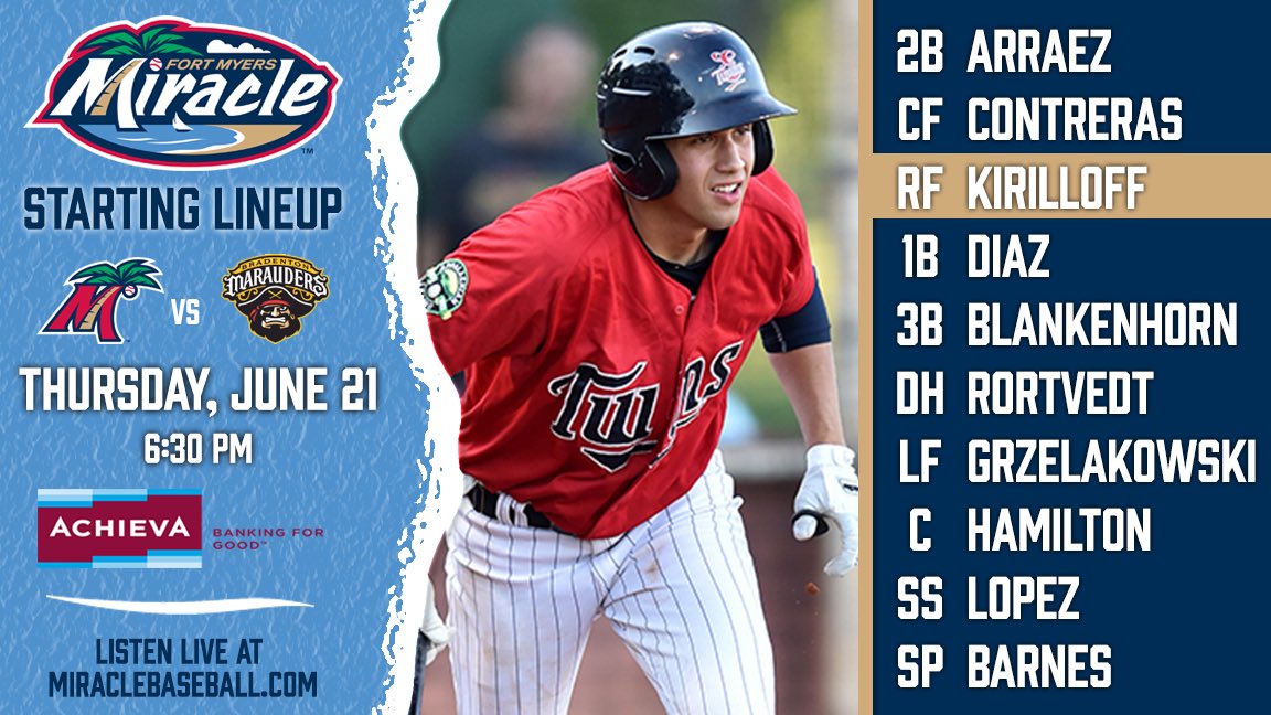 Alex Kirilloff bats 3rd for the Miracle tonight in Bradenton! Listen live: https://tunein.com/radio/Fort-Myers-Miracle-Baseball-Network-s114988/?utm_content=s114988&utm_medium=referral&utm_source=tiEmbed …pic.twitter.com/eKjAFXWWW0