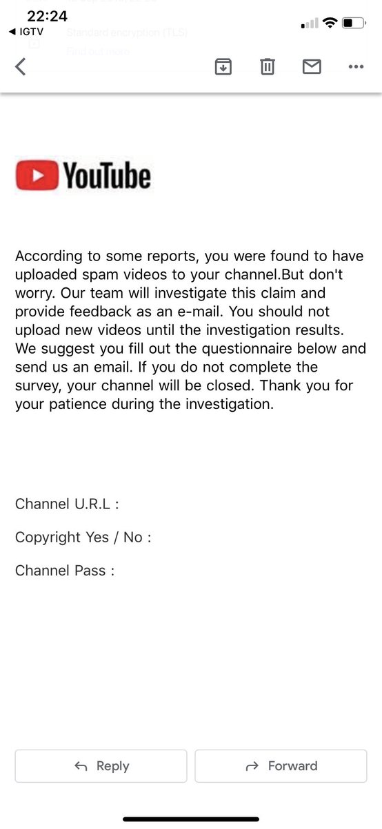 @TeamYouTube hey guys, is there anywhere we can report spam emails to you? Don’t want anyone getting caught out by this! Thankspic.twitter.com/sZe8JGcBfM
