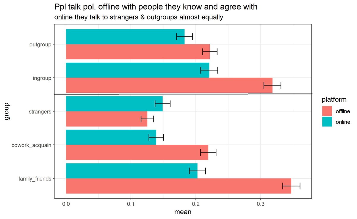True. And these data also imply that echo-chambers are stronger offline than online, interestingly not because people talk more to out-groups online, but bc they talk to in-groups even less.pic.twitter.com/6GdbP2ltnS