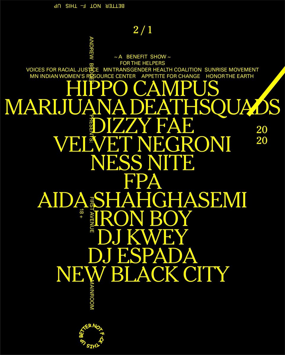 @thehalocline.@M_Deathsquads.@DizzyFae.@VelvetNegroni.@nessnite.@francespriya.@aidashahghasemi. Iron Boy.@kwey_.@Espada316.@NewBlackCity_MN. All this Saturday at a@FirstAvenue benefit show curated by@AndrewBroder. https://blog.thecurrent.org/2020/01/andrew-broder-announces-stacked-first-ave-benefit-show-featuring-hippo-campus-and-many-more/ …pic.twitter.com/3rZVUeZfnP