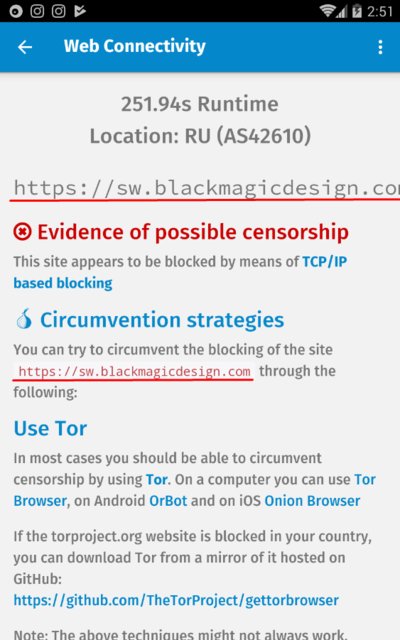 Due the witch-hunt for #Telegram of course. Run#OONI Probe to test for#censorship! https://run.ooni.io/nettest?tn=web_connectivity&ta=%7B%22urls%22%3A%5B%22http%3A%2F%2Fsw.blackmagicdesign.com%22%2C%22https%3A%2F%2Fsw.blackmagicdesign.com%22%5D%7D&mv=1.2.0 …pic.twitter.com/aJ8qnOBRNq