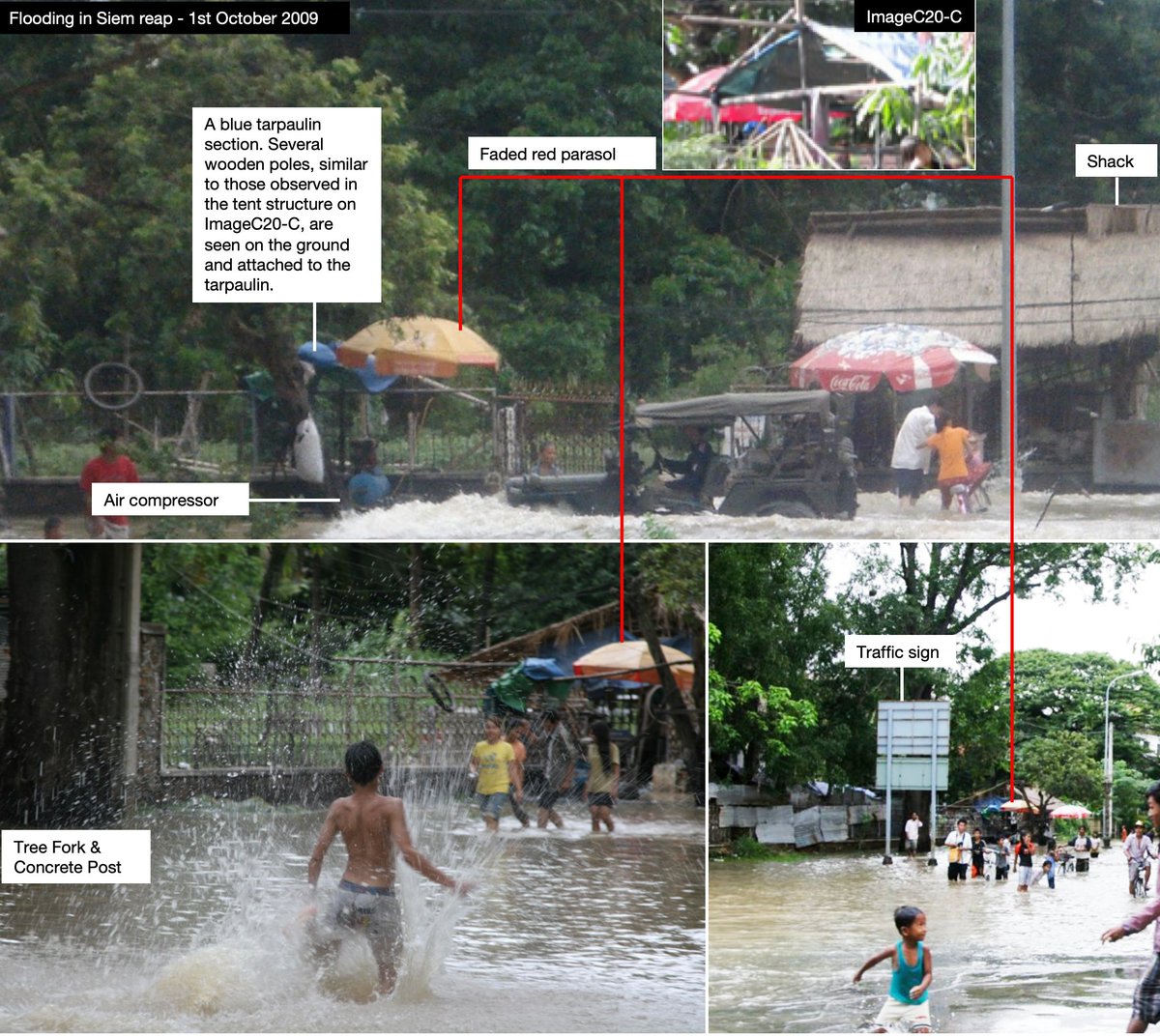 October 2009. Flooding affected the riverside area on October 1st 2009. A wooden structure similar to the one featured on ImageC20-C.. A damaged blue/green tarpaulin next to a faded red parasol. The lettering on this parasol looks very similar to the one featured on ImageC20-C.pic.twitter.com/3LyjiEqTBi