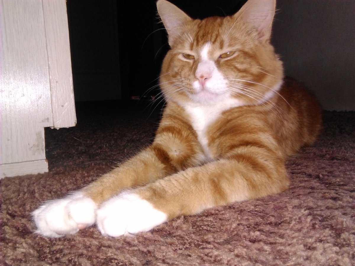 What a handsome #TeamOrangeAndProud member. Our 2 Orange Tabbies also hate Mondays. Dave is the Burnt Orange tabby w/the toy. Emerson is the Cream Orange tabby saying hey Monday, talk to my butt.
