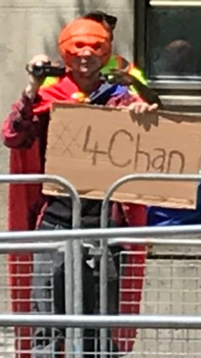 A couple of the yellow vest citizen journalists sporting cameras are here now. There is also some dude with a 4chan sign. They’ve are in a corralled area the cops set up.pic.twitter.com/fJ5aU5RJS8
